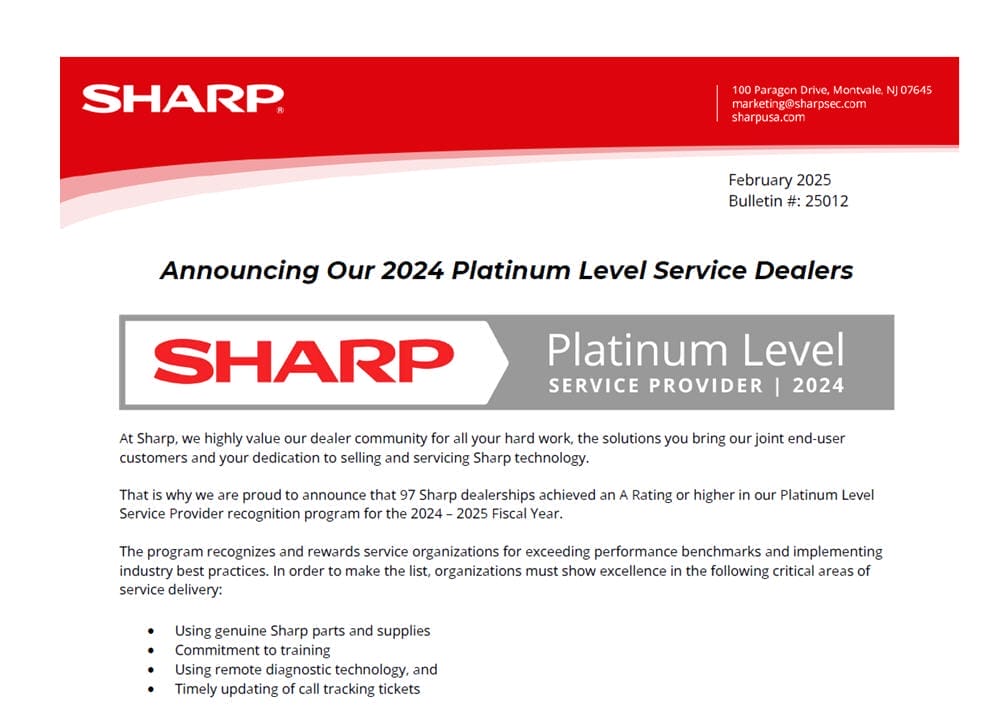 “Sparks Office Solutions has diligently been keeping up with all the new technologies and products that Sharp has introduced in the past 2 years. It has paid off. Sparks Office Solutions has accomplished this by providing the very best support for our customers by having the knowledge to do so. Sparks Office Solutions has certain criteria that we require to be met, all our technicians are factory trained, and we respond within 4 business hours to calls on both the customer side and Sharp Electronic Service end.”