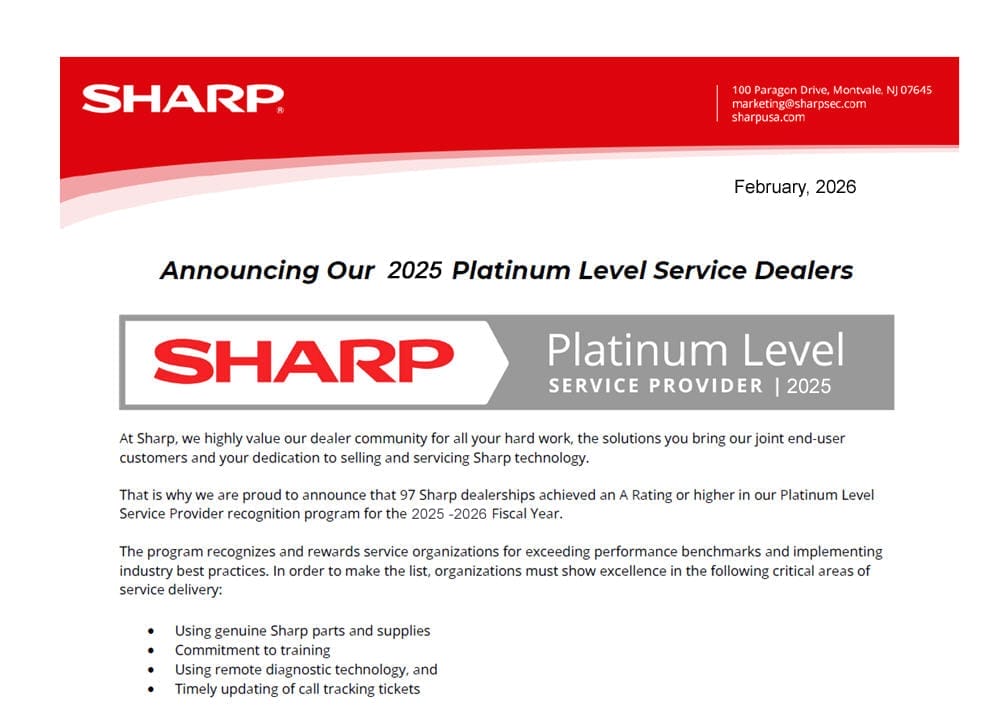Sparks Office Solutions is proud to announce that it has been honored with the Sharp Hyakuman Kai Award, a prestigious recognition celebrating outstanding sales achievements and exceptional customer support. This award is presented annually to top-performing Sharp dealers who demonstrate excellence in providing cutting-edge office technology and superior service.